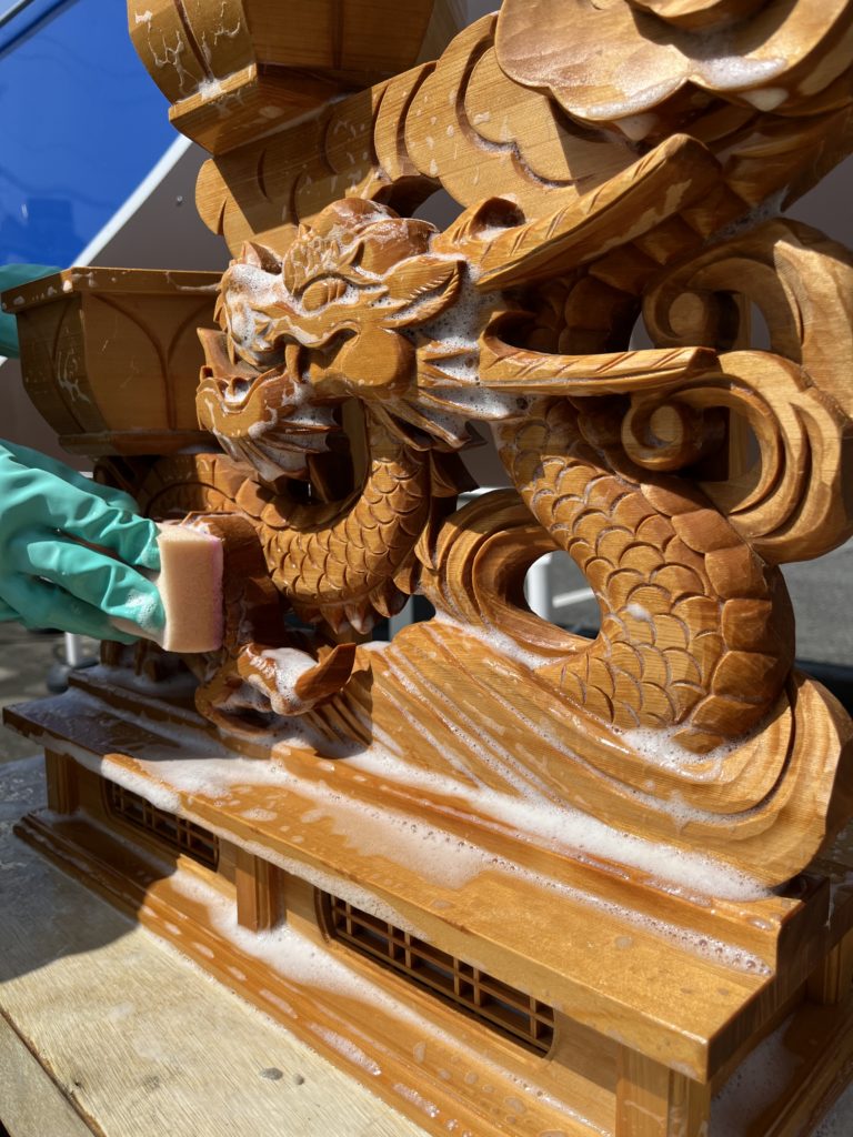 祭壇クリーニング 2023年6月7日 | コメントはまだありません 祭壇の分解及び修繕箇所確認 水洗い洗浄 埃などを水で洗い、専用の薬品で汚れを洗浄します。洗浄後乾燥させます。 ※紙の張替えがある場合はここで剥がします。 薬品吹きつけ 専用の薬品を全体に吹きつけ、拭き取ります。 祭壇組み立て 未分類